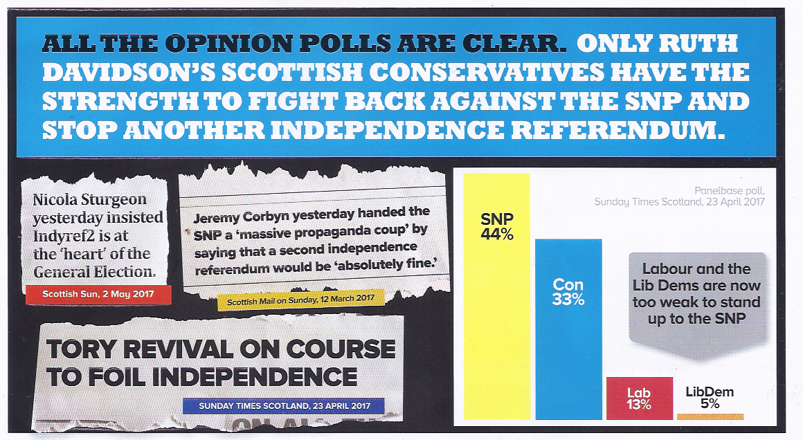 The latest offering – once again from the Conservatives – does not feature their local candidate Iain McGill, but does have 4 pictures of Ruth Davidson, 2 of Theresa May and 2 of Nicola Sturgeon.