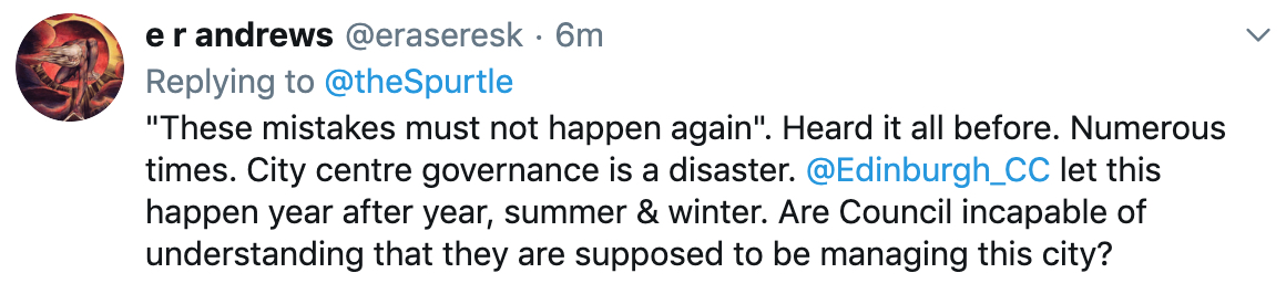 Looking forward, he said, we must ensure mistakes of commission and communication are addressed. Hence Point E in amendment. He wants a full understanding of Edinburgh’s Christmas 2020 well in advance. ‘I am not prepared to be played for a fool by Underbelly’, which he accused of evasion and distraction this morning. ‘No more, no more. The people of this city deserve better.’