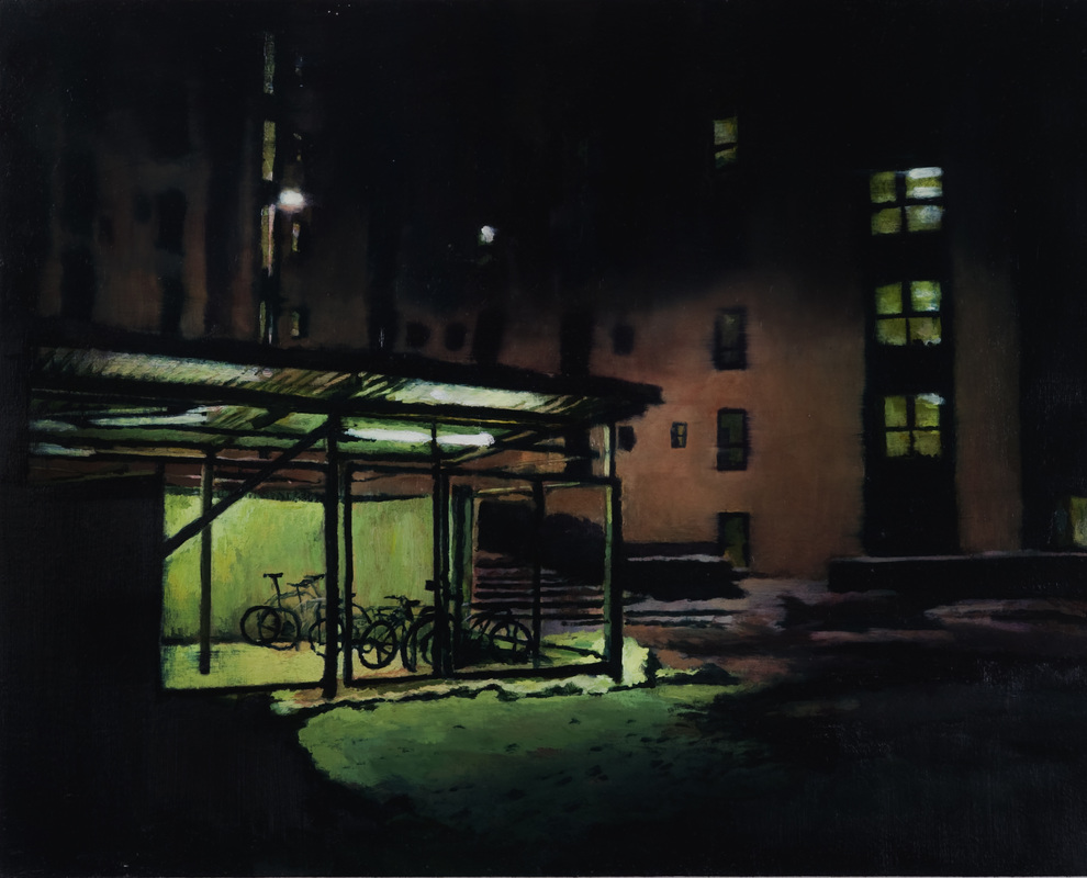 The previously mentioned bike shed appears in ‘Bike Shed in Snow’. I found it fascinating how the fluorescent lighting from the the striplights pours out into the car park like a stream of water. This is a wonderful painting and my favourite of those on display.