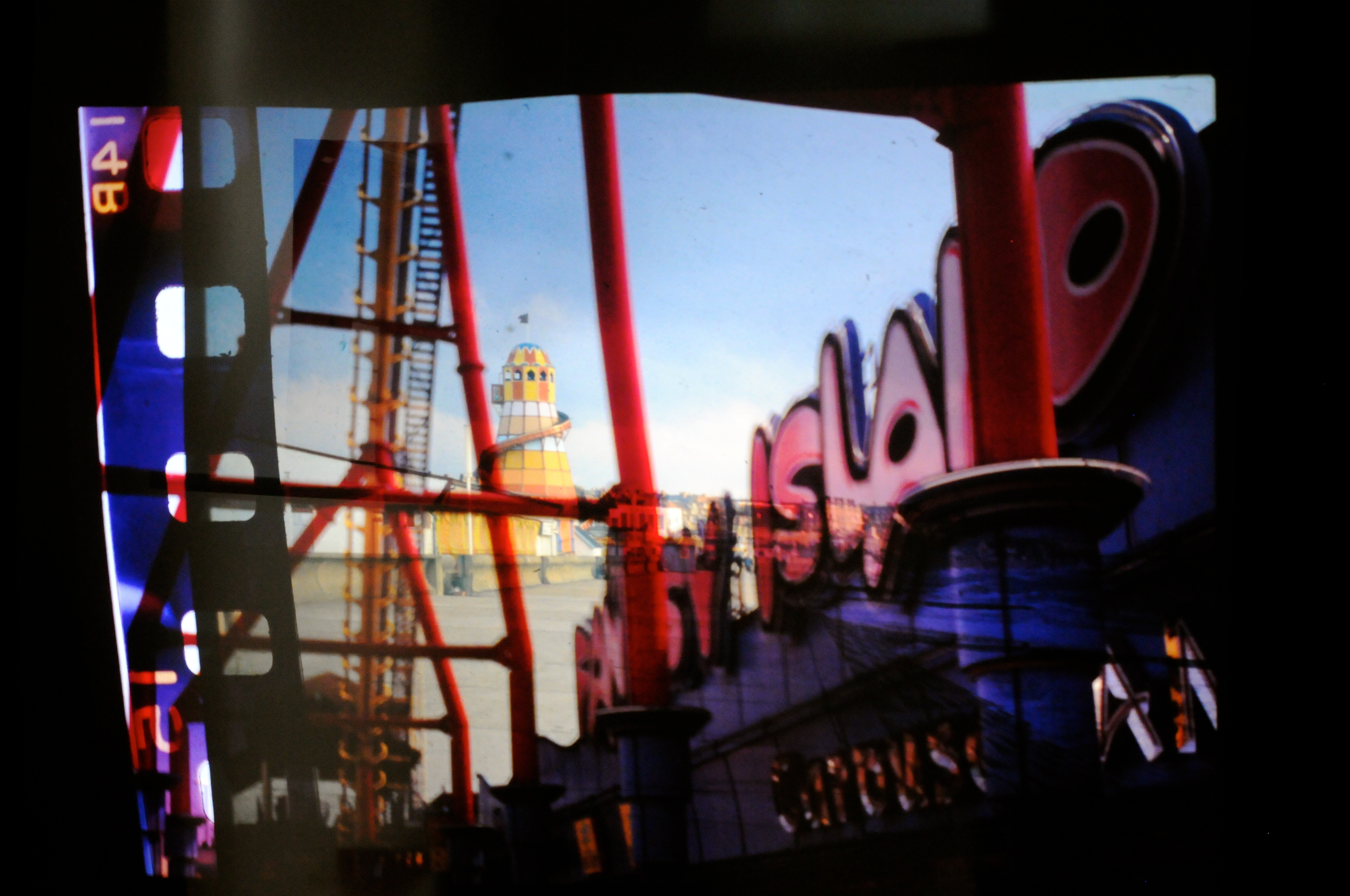 Her fairground scenes have much to say on entropy, mortality and the impermanence of pleasure, but I find tenderness here, too. Her blood-reds are rooted in the beating hearts, the G-forced bruises on the muscles of her mostly unseen cast. Occasional ghosts stare from the images to fix one’s gaze, iron networks have the intricacy and vulnerability of insect wings, and in ‘Wild River’, an old sign boasts of thrills perhaps never truly realised on this rickety gutter. The paradox of the ride’s name is simultaneously touching and bathetic: ‘Wild River’ – manmade and evidently tame – hardly even runs with water.