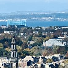 The view from Calton Hill at 11:05am.Broughton St Mary's Parish Church, Granton Gas Holder (Mossmorran in the background), Tropical Palm House (Royal…