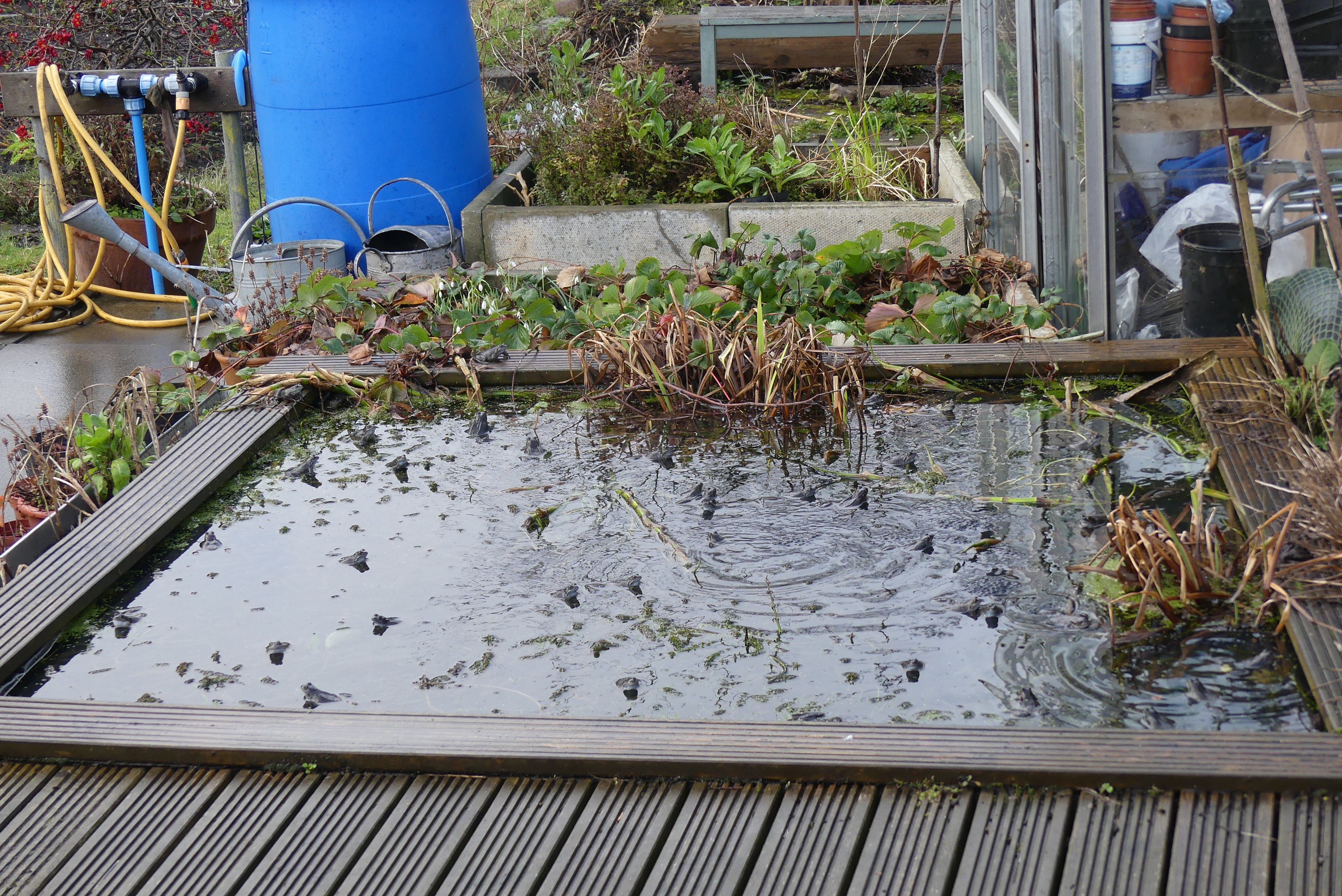 Spurtle can't tell the difference between multiple frogs and multiple toads disporting themselves in the altogether (we lost count at 30), but there was certainly no shortage of amphibian activity in the allotment pond beside East Scotland Street Lane this afternoon.