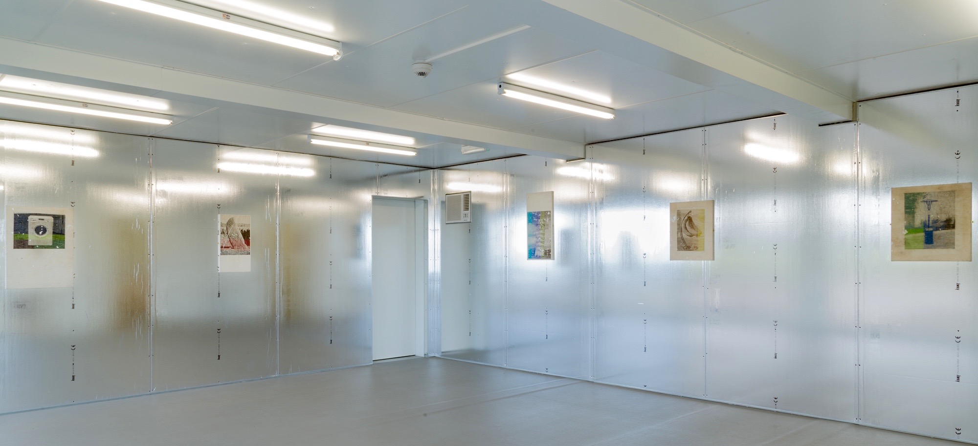 The works are painted onto decorators’ old dust sheets, but the images don’t fill the whole, handmade, makeshift frames. They curiously appear there like stencils by a graffiti artist. The reflective panelling on the walls is supposed to give the whole room a backstage feel, as if we’ve wandered into a space not quite ready to be seen by an audience.