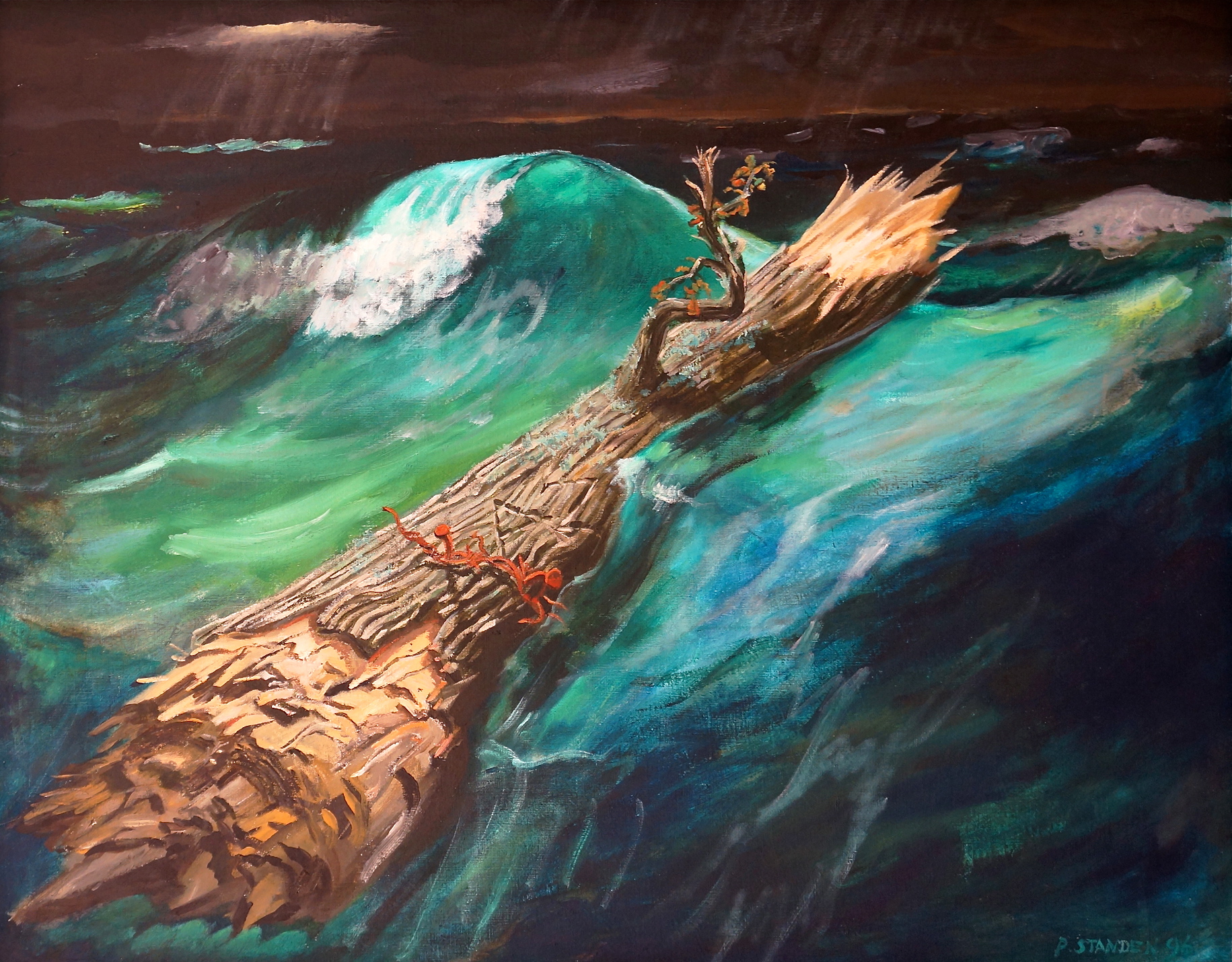 Next, we are taken on a voyage across the ocean where a fallen tree, the last of its kind, is thrown about by ferocious waves. Standen’s use of colour in ‘Voyage from Arcadia (The Last Tree)’ is exquisite. There are so many different shades that it’s difficult to count them, but they come together seamlessly and place you in the middle of the ocean where it’s impossible not to imagine being dragged away on the tides.