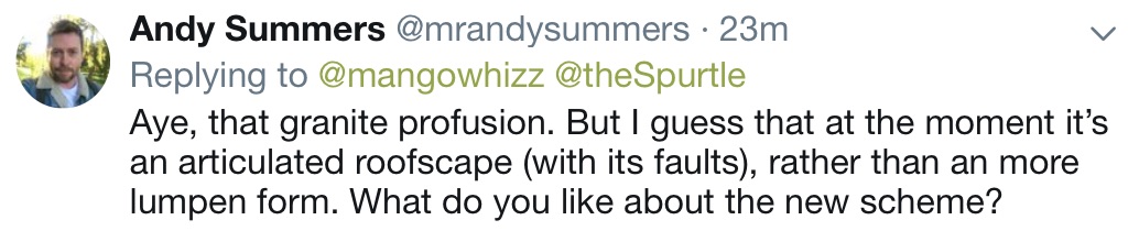 E-mail from Alan Welsh: Yet again a wasted opportunity. Integration of the existing buildings is what should happen.