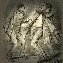 Dalgleish and Milton, in the double capacity of stewards and “seconds,” kept the crowd back, and shouted judious advice and encouragement to their respective champions. Everything proceeded satisfactorily for five minutes, when two constables appeared on the scene, and brought the fight to a summary conclusion.
