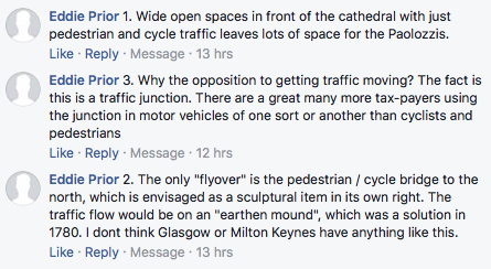 Some people seem to think that getting traffic moving away fast is bad - why? If there are no cyclists or pedestrians around, the quicker the better.The principle thinking was to keep cyclists and pedestrians away from cars. This would do that.Its not a flyover - its a grassy ‘mound’. Using the incline already in Leith Street, simply build up the road at a level, then drop down after crossing the two roads.The Mound on Princes Street seems to have worked OK. And thats not expensive - Two archways for traffic and one for the rest of us, and a lot of infill and some grass seeds.Personally, I am a retired graphic designer with too much time on my hands.
