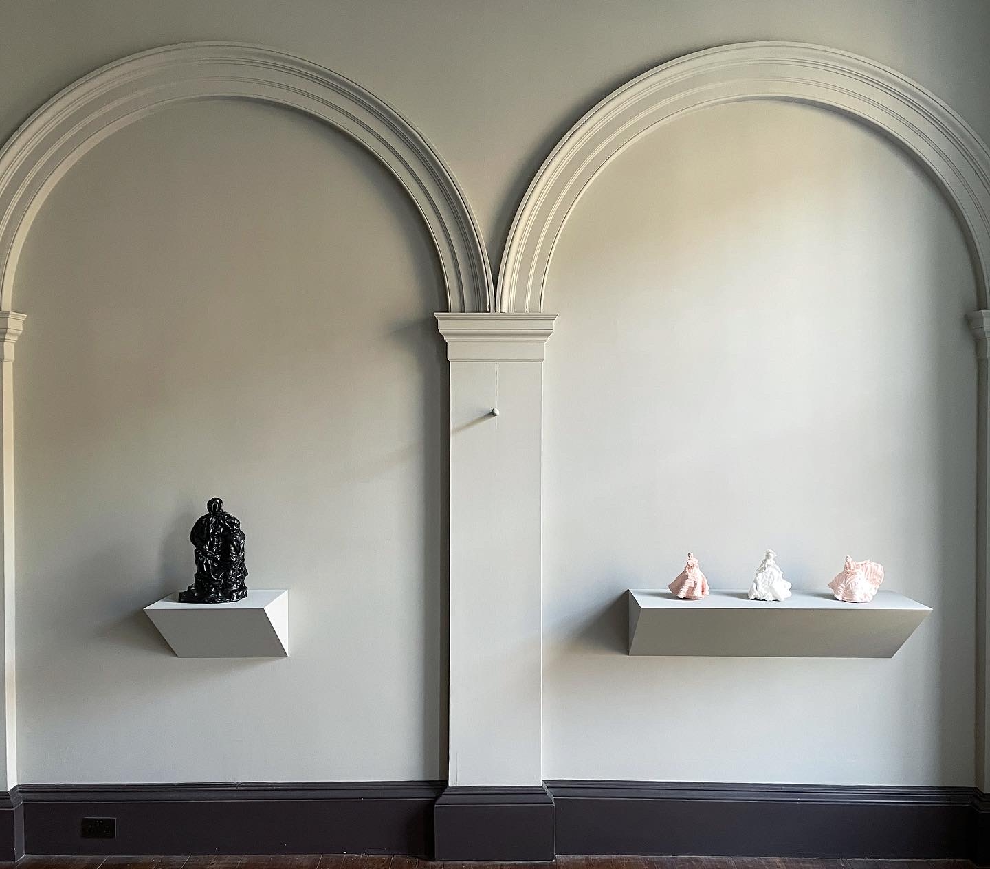 In this installation, the reworked pieces form two separate series; one playing with Bone China Figures of women, the other with classical statues as pictured and supposedly available in Online Shopping.