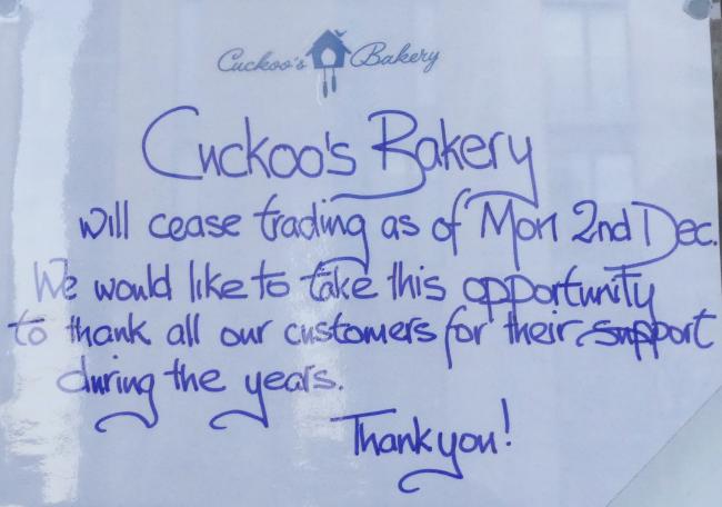 Locals were shocked this morning to find a note on the door of Cuckoo’s Bakery saying the business had ceased trading.