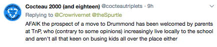 Some parents of children at Drummond and its feeder schools are alarmed at this suggestion and are now mobilising to resist it. (Nobody yet knows their exact number, but our understanding is that they're a considerable portion of the total parent body.)