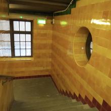 On belatedly paying attention, this is what became apparent: an enormous 360º Tequila Sunrise. It may well be the tangerine path to the Everlasting Bonfire, or the Bongo Club, or both. If any reader can date the tiles, it would be interesting to hear from them.