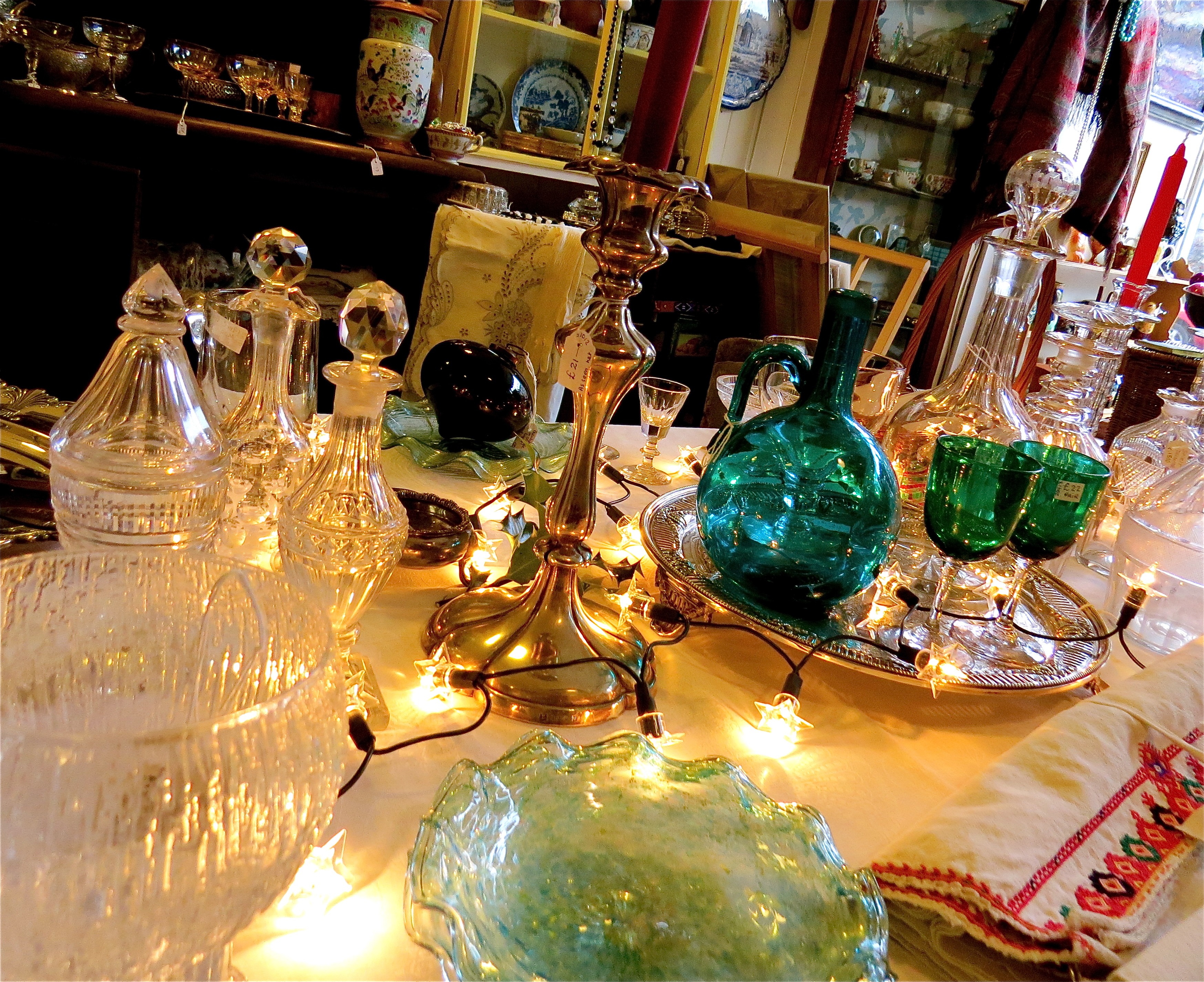 This glittering array of festive glassware, decanters and carafes (decanters without stoppers) caught the eye in Duncan & Reid Books and Antiques at 5 Tanfield last week. The shop stocks all manner of unexpected treasures – including porcelain, jewellery, fabrics, pictures, and other old and intriguing stuff.