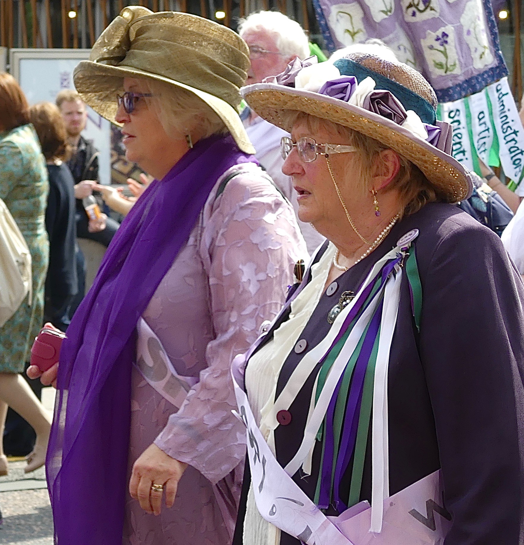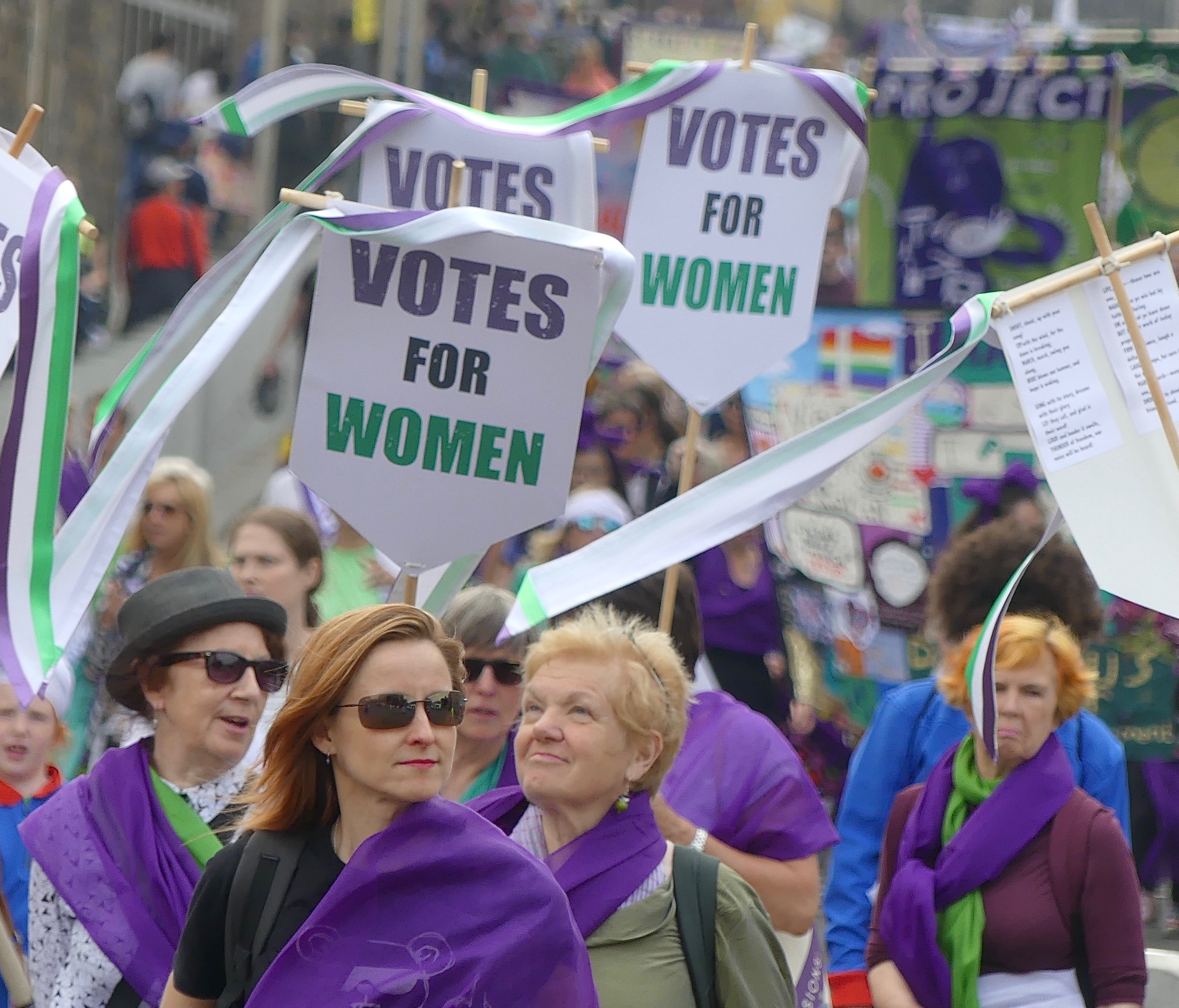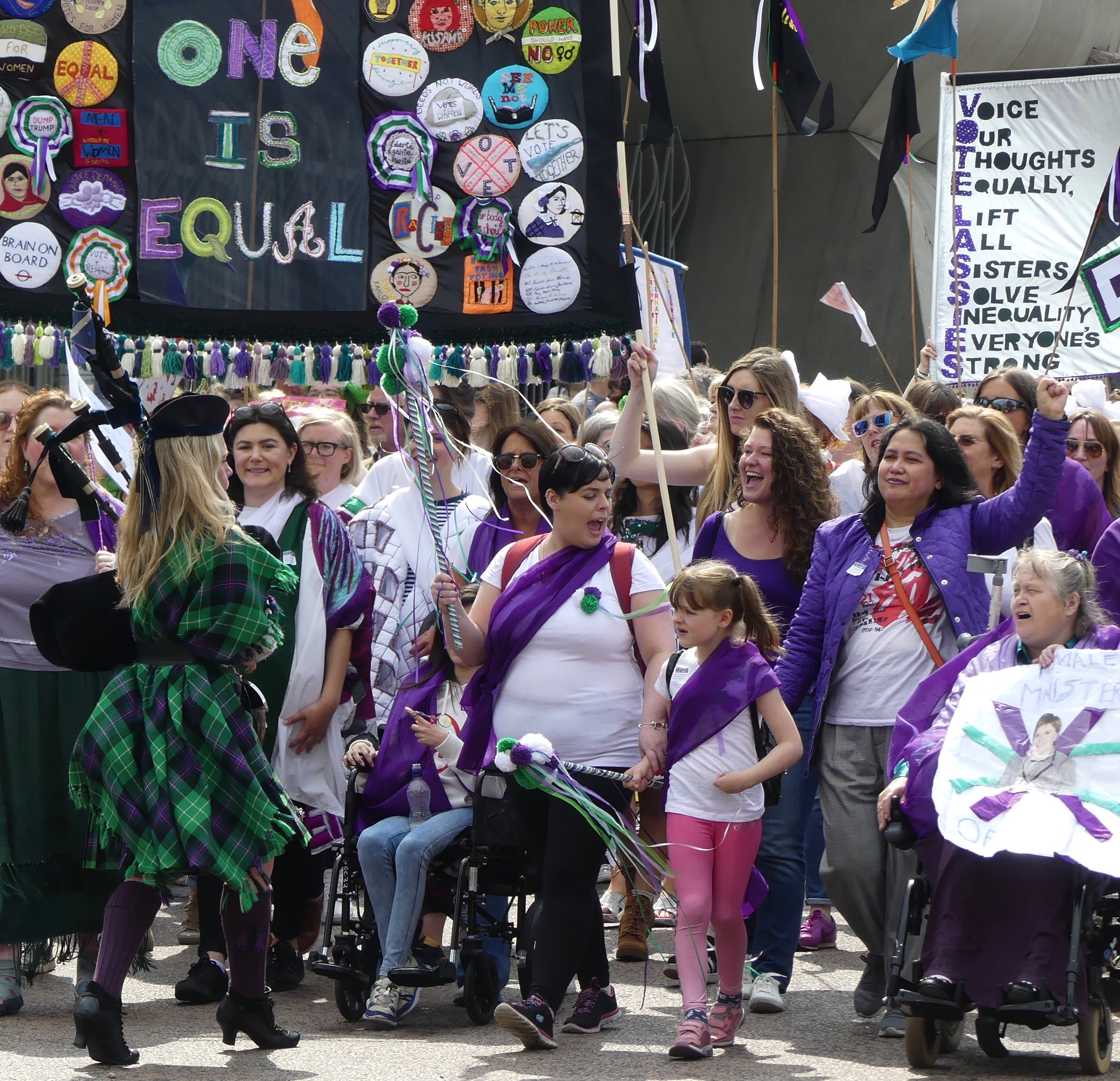 This afternoon’s Processions event was a joyful, multi-coloured, multi-aged celebration of UK women’s suffrage 100 years on.